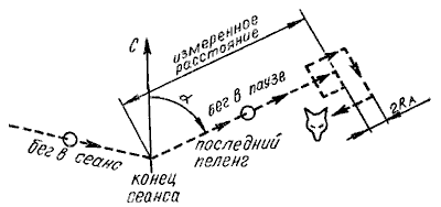 Поиск в паузе. В паузе надо использовать следы, звуки, запахи, оставленные и производимые судьями, автомашиной, аппаратурой. «Технический» метод поиска с использованием дальномера и радиокомпаса (рис. 76) завершается визуальным поиском по спирали «коробочкой». В сложных ситуациях иногда легче найти «лису» по принципу «куда бы спрятался сам». Основные правила поиска в паузе: никогда ни на минуту не прекращать наблюдение и поиск, искать в первую очередь там, куда показывает пеленг, двигаться только бегом, не стоять, смотреть на деревья, учитывать опасность недохода. Для успеха важно взять точный пеленг в конце сеанса и точно выдерживать направление.
